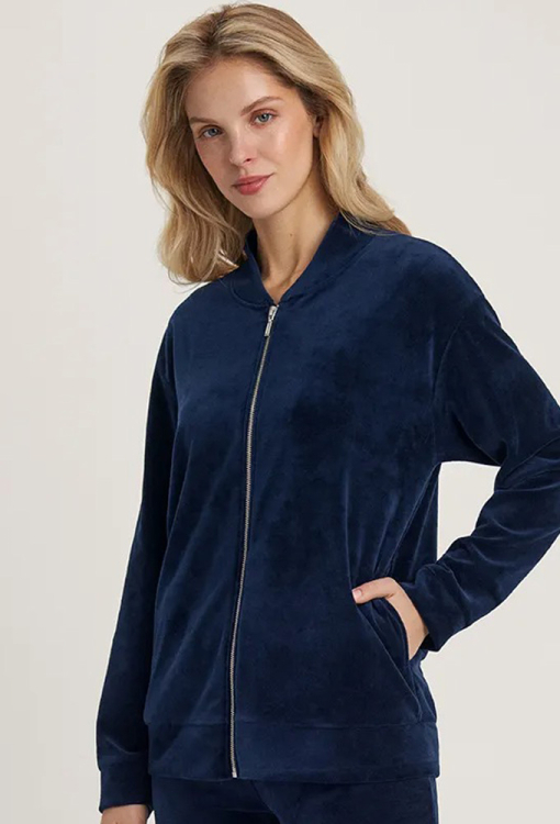 Красивый женский костюм из коллекции Mare от украинского бренда Ellen. Костюм выполнен из мягкого и качественного велюра синего цвета, состоит из кофты со штанами прямого силуэта. Кофта с длинными рукавами, небольшим V-образным вырезом горла и удобными боковыми карманами, застегивается на молнию. Горловина, рукава и низ модели обработаны манжетами, штаны с мягкой резинкой в поясе. Костюм стильный и очень комфортный, идеален для домашнего уюта в холодную пору, а также может быть полезным подарком любимому или близкому человеку.