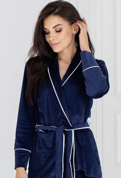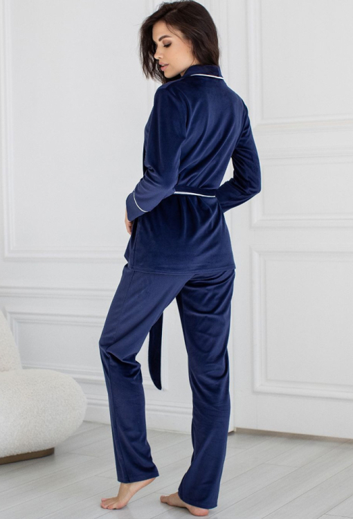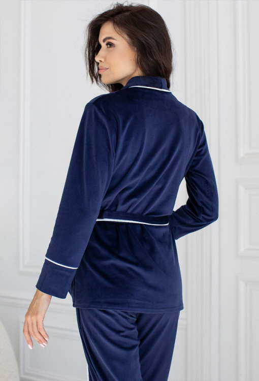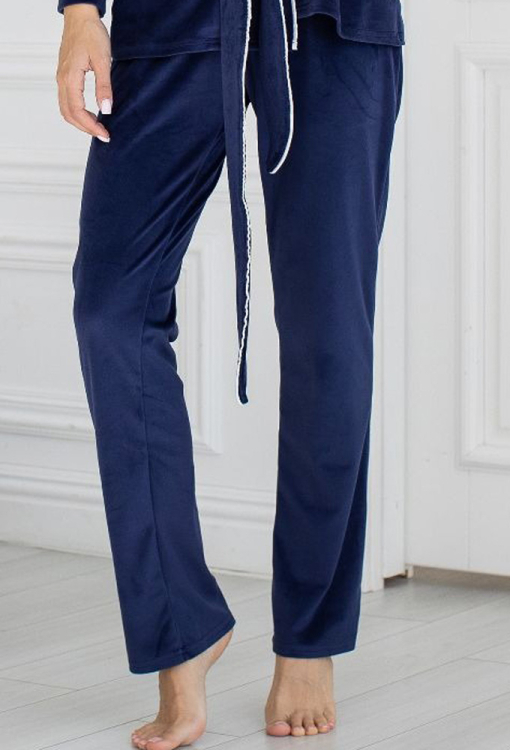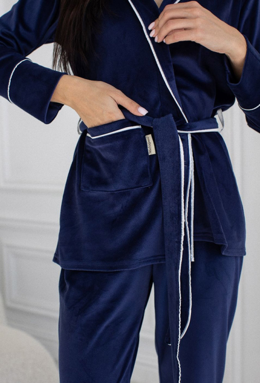 Элегантный женский костюм от украинского бренда MiaNaGreen. Костюм выполненный из мягкого и качественного велюра синего цвета, состоит из жакета и штанов. Жакет свободного силуэта, с длинными рукавами и воротником шаль, завязывается на запах с помощью длинного пояса. Внизу справа модель обработана накладным карманом, воротник, полки, рукава, карман и пояс украшены тонким кантом белого цвета. Штаны прямого кроя, с удобной посадкой и мягкой резинкой в поясе. Костюм очень красивый и приятный к телу, идеален в качестве домашней одежды или подарка!