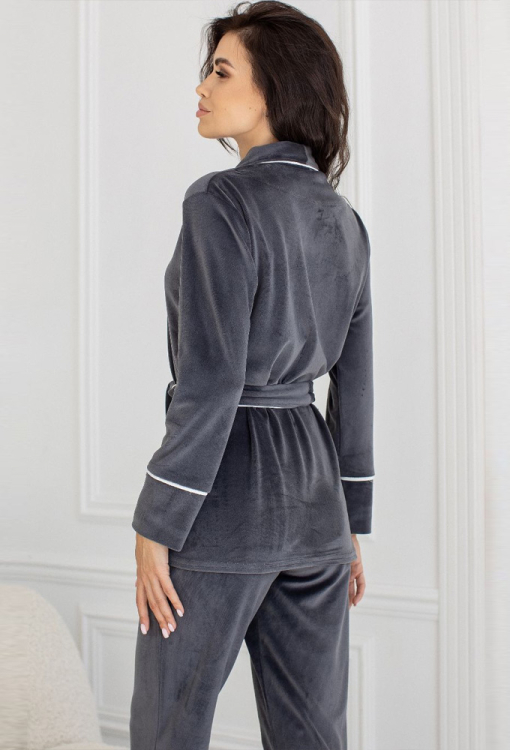Элегантный женский костюм от украинского бренда MiaNaGreen. Костюм выполненный из мягкого и качественного велюра графитового цвета, состоит из жакета и штанов. Жакет свободного силуэта, с длинными рукавами и воротником шаль, завязывается на запах с помощью длинного пояса. Внизу справа модель обработана накладным карманом, воротник, полки, рукава, карман и пояс украшены тонким кантом белого цвета. Штаны прямого кроя, с удобной посадкой и мягкой резинкой в поясе. Костюм очень красивый и приятный к телу, идеален в качестве домашней одежды или подарка!