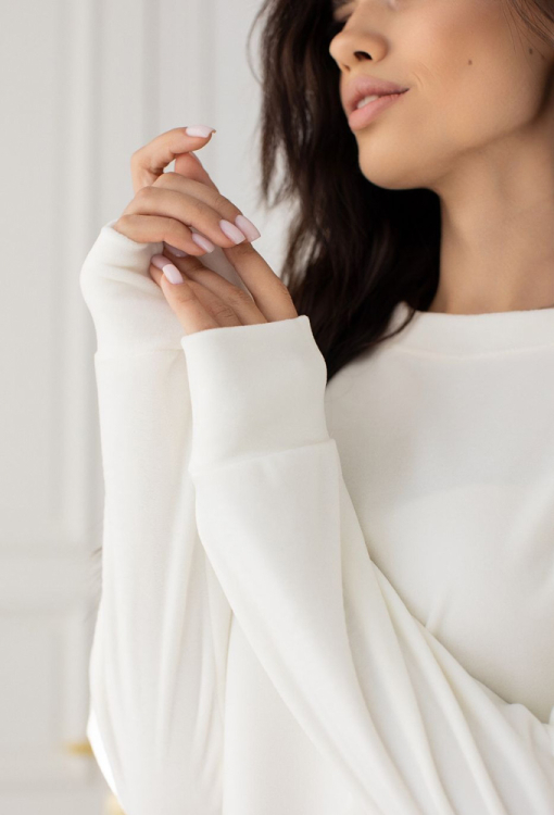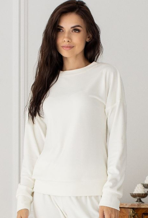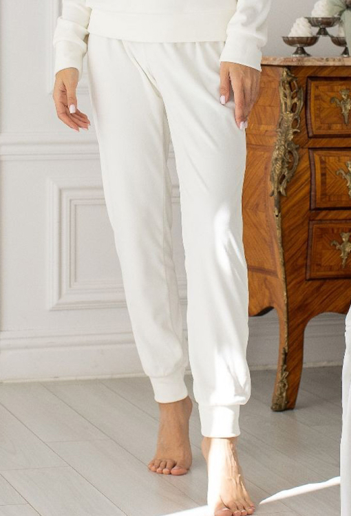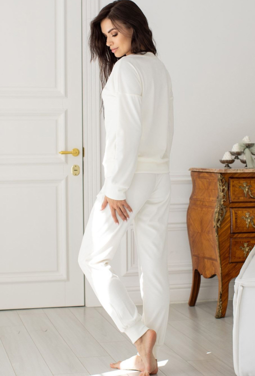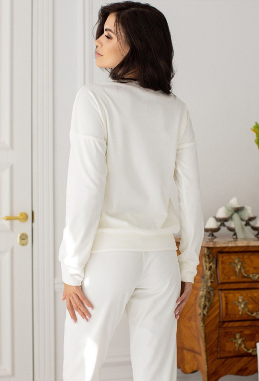 Удобный и теплый женский костюм от украинского бренда MiaNaGreen. Костюм выполненный из мягкого и качественного велюра кремового цвета, состоит из кофты и штанов. Кофта свободного силуэта, с длинными рукавами, круглым вырезом горла и заниженным плечевым швом, горловина, рукава и низ модели обработаны манжетами. Штаны с удобной посадкой и мягкой резинкой в поясе, внизу на манжетах. Костюм очень красивый и приятный к телу, идеален для домашнего отдыха и подарка близким людям!