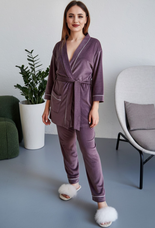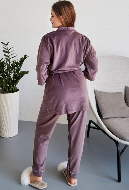 Уютный женский костюм от украинского бренда Tomiko. Костюм выполнена из мягкого и качественного велюра лавандового цвета, состоит из короткого халата и штанов прямого кроя. Халат свободного силуэта с рукавами 3/4 и накладным карманом, завязывается на запах с помощью пояса и завязок внутри. Вырез, борта, рукава и карман модели украшены тонким кантом белого цвета. Штаны с мягкой резинкой в поясе и контрастным кантом внизу, создают удобную посадку и не сковывают движений. Костюм стильный и комфортный, приятно согревает и позволяет расслабиться после насыщенного дня, также может быть замечательным подарком близким людям.
