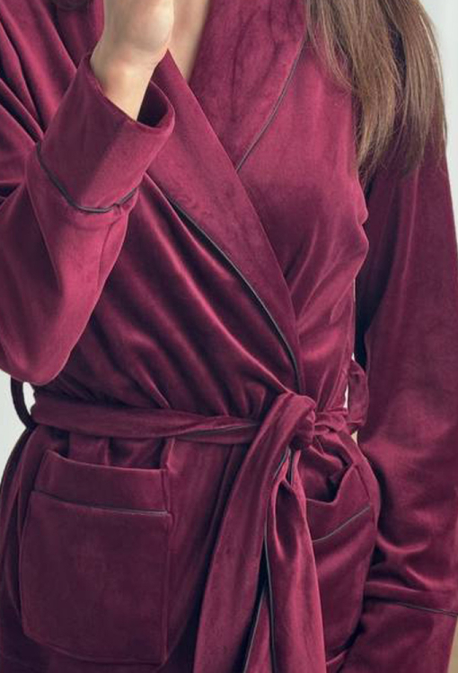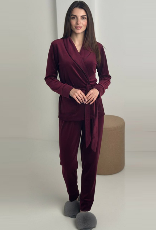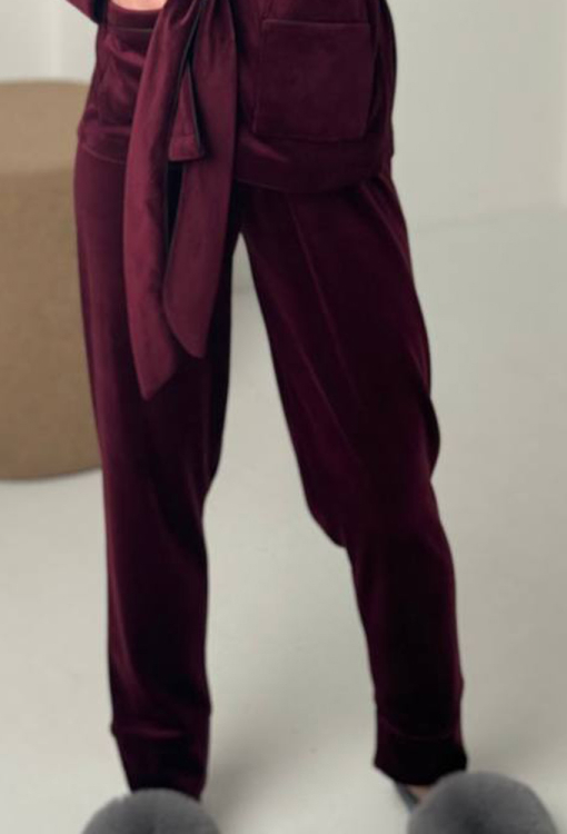 Стильный женский костюм от украинского бренда V.Velika. Модель выполнена из мягкого и качественного велюра бордового цвета, состоит из короткого халата и зауженных штанов. Халат с длинными рукавами на манжетах и воротником шаль завязывается на запах с помощью длинного пояса. Модель дополнена двумя накладными карманами, воротник, полочки, рукава, карманы и пояс украшены тонким черным кантом. Штаны с мягкой резинкой в поясе и контрастным кантом по линии манжет. Костюм невероятно красивый и комфортный, идеально подходит для уютных домашних вечеров и станет прекрасным подарком для любимого и близкого человека.