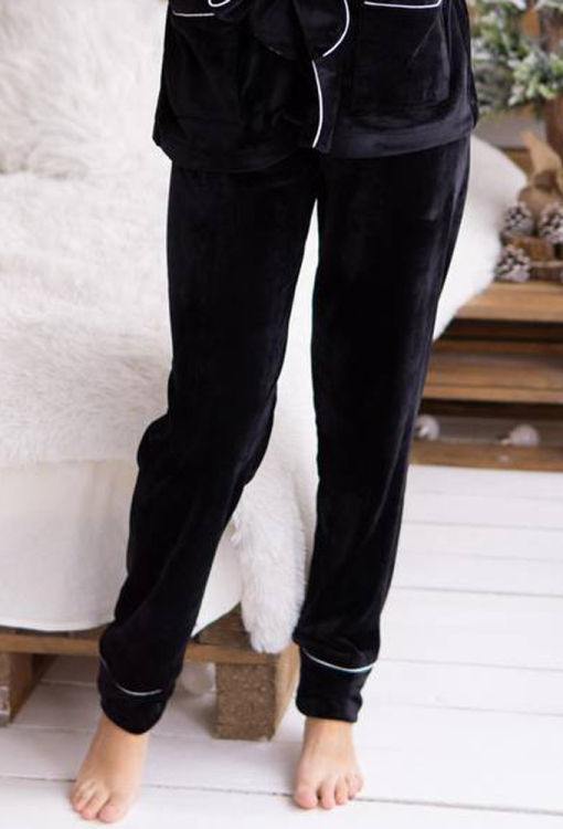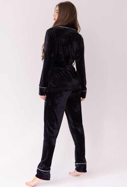 Стильный женский костюм от украинского бренда V.Velika. Модель выполнена из мягкого и качественного велюра черного цвета, состоит из короткого халата и зауженных штанов. Халат с длинными рукавами на манжетах и воротником шаль завязывается на запах с помощью длинного пояса. Модель дополнена двумя накладными карманами, воротник, полочки, рукава и карманы оформлены тонким белым кантом. Штаны с мягкой резинкой в поясе и контрастным кантом по линии манжет. Костюм невероятно красивый и комфортный, идеально подходит для уютных домашних вечеров и станет прекрасным подарком для любимого и близкого человека.