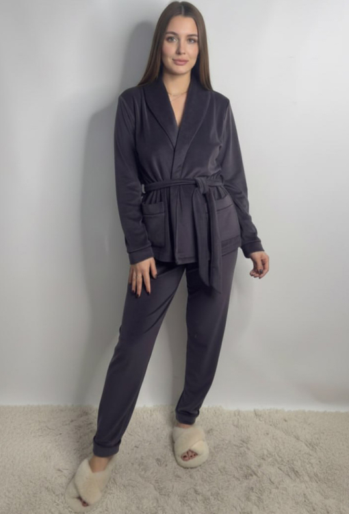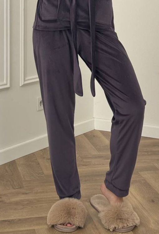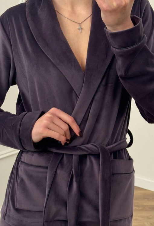 Шикарный женский костюм от украинского бренда V.Velika - эффектное сочетание элегантности и продуманного комфорта. Модель выполнена из мягкого и качественного велюра фиолетового цвета, который придаёт образу роскошный вид. Комплект состоит из короткого халата и зауженных штанов, создавая гармоничный домашний образ. Халат с длинными рукавами на манжетах и воротником шаль завязывается на запах с помощью длинного пояса, красиво подчеркивая талию. Модель дополнена двумя накладными карманами, воротник, полочки, рукава и карманы оформлены тонким черным кантом, который добавляет изысканный акцент. Штаны с мягкой резинкой в поясе не сковывают движений и дарят максимальное удобство, манжеты с контрастным кантом завершают стильный образ. Костюм невероятно красивый и комфортный, идеально подходит для уютных домашних вечеров и станет прекрасным подарком для любимого и близкого человека.