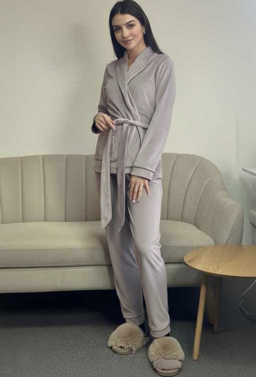 Уютный женский костюм от украинского бренда V.Velika. Модель выполнена из мягкого и качественного велюра пудрового цвета с перламутровым оттенком, состоит из короткого халата и зауженных штанов. Халат с длинными рукавами на манжетах и воротником шаль завязывается на запах с помощью длинного пояса. Модель дополнена двумя накладными карманами, воротник, полочки, рукава, карманы и пояс украшены тонким черным кантом. Штаны с мягкой резинкой в поясе, внизу обработаны свободными манжетами с контрастным кантом. Костюм невероятно красивый и комфортный, идеально подходит для домашних вечеров, а также станет прекрасным подарком для любимого и близкого человека.
