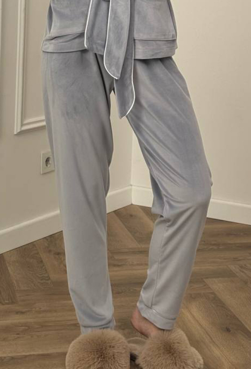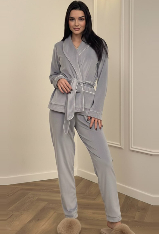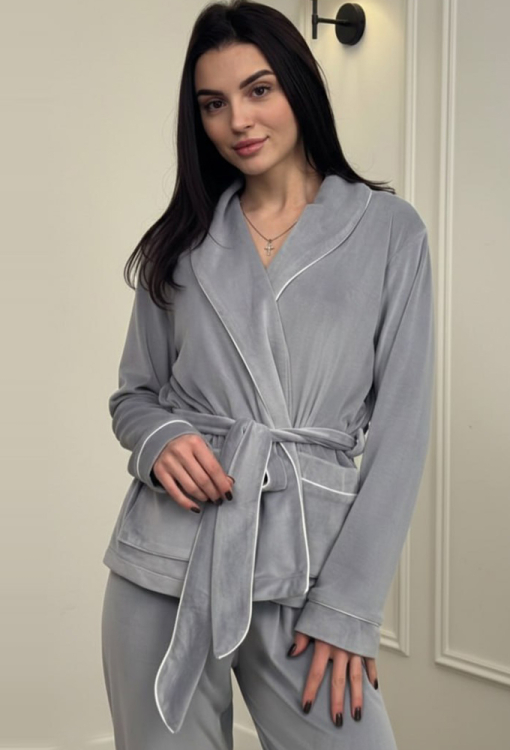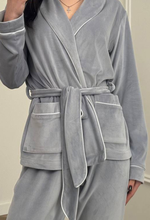 Стильный женский костюм от украинского бренда V.Velika. Модель выполнена из мягкого и качественного велюра серого цвета, состоит из короткого халата и зауженных штанов. Халат с длинными рукавами на манжетах и воротником шаль завязывается на запах с помощью длинного пояса. Модель дополнена двумя накладными карманами, воротник, полочки, рукава, карманы и пояс украшены тонким белым кантом. Штаны с мягкой резинкой в поясе и контрастным кантом по линии манжет. Костюм невероятно красивый и комфортный, идеально подходит для уютных домашних вечеров и станет прекрасным подарком для любимого и близкого человека.