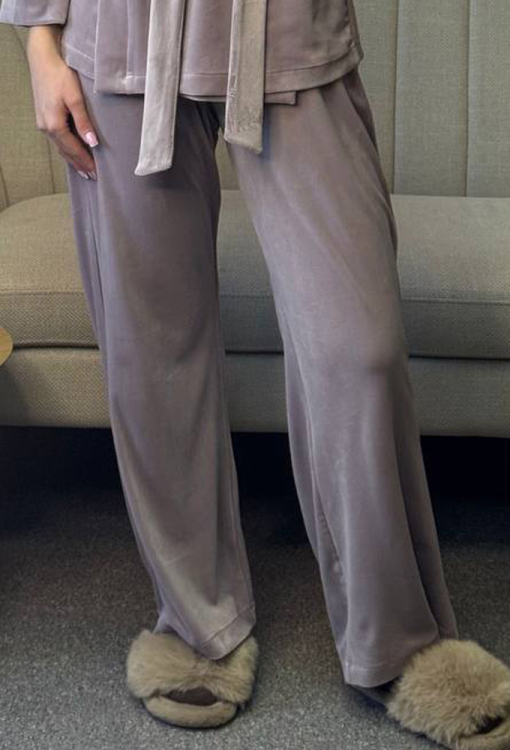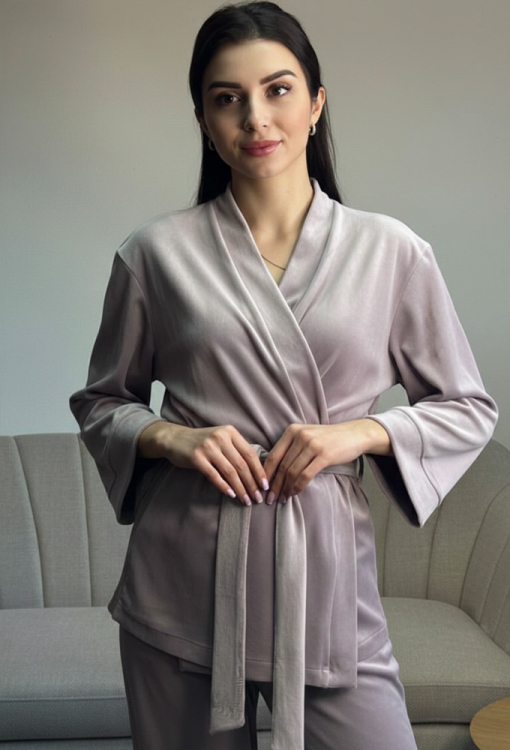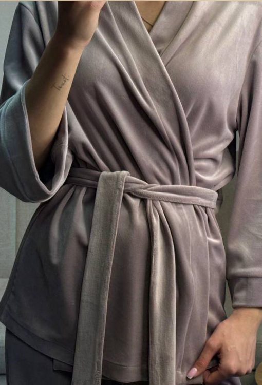 Элегантный женский костюм от украинского бренда V.Velika. Костюм выполнен из мягкого и качественного велюра пудрового цвета с перламутровым оттенком, состоит из короткого халата и широких штанов. Халат свободного силуэта и с длинными рукавами, завязывается на запах с помощью пояса и внутренних завязок. Рукава модели обработаны свободными манжетами. Штаны с мягкой резинкой в поясе и удобными боковыми карманами, регулируются по ширине с помощью внутреннего шнурка. Костюм невероятно красивый и комфортный, идеален для уютных домашних вечеров или подарка любиму и близкому человеку.