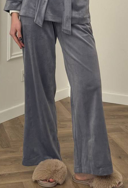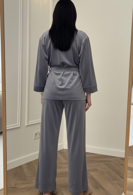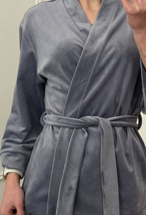 Классический женский костюм от украинского бренда V.Velika - стильное сочетание элегантности, комфорта и уюта. Костюм выполнен из мягкого и качественного велюра серого цвета, который придает образу благородство и роскошный вид. Комплект состоит из короткого халата и штанов свободного силуэта, создавая гармоничный домашний образ. Халат с длинными рукавами на свободных манжетах завязывается на запах с помощью пояса, красиво подчеркивая талию. Штаны с удобной посадкой и мягкой резинкой в поясе не сковывают движений и дарят максимальное удобство. Костюм невероятно красивый и комфортный, идеален для уютных домашних вечеров или подарка любиму и близкому человеку.