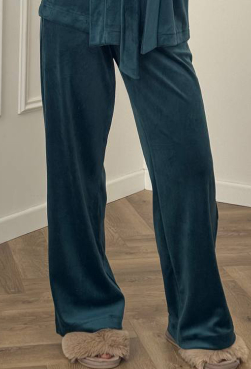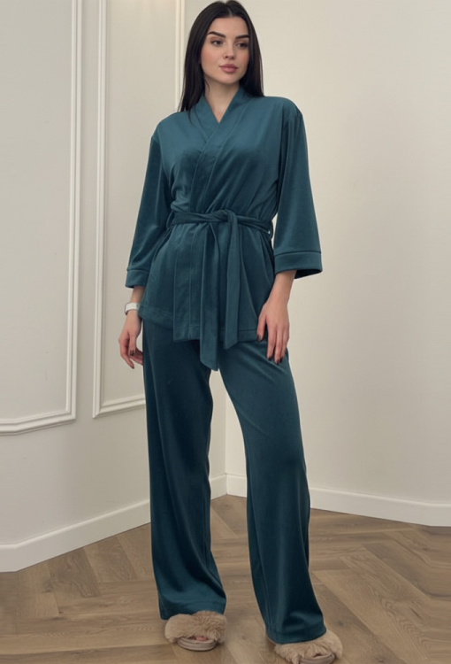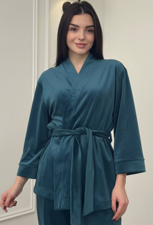 Классический женский костюм от украинского бренда V.Velika. Костюм выполнен из мягкого и качественного велюра изумрудного цвета, состоит из короткого халата и штанов свободного силуэта, создавая гармоничный домашний образ. Халат с длинными рукавами на свободных манжетах завязывается на запах с помощью пояса, красиво подчеркивая талию. Штаны с удобной посадкой и мягкой резинкой в поясе не сковывают движений и дарят максимальное удобство. Костюм невероятно красивый и комфортный, идеален для уютных домашних вечеров или подарка любиму и близкому человеку.