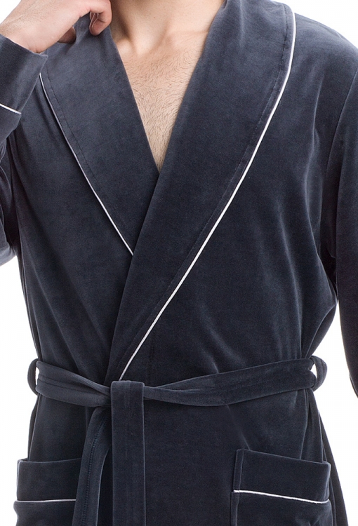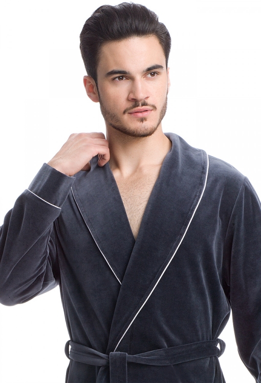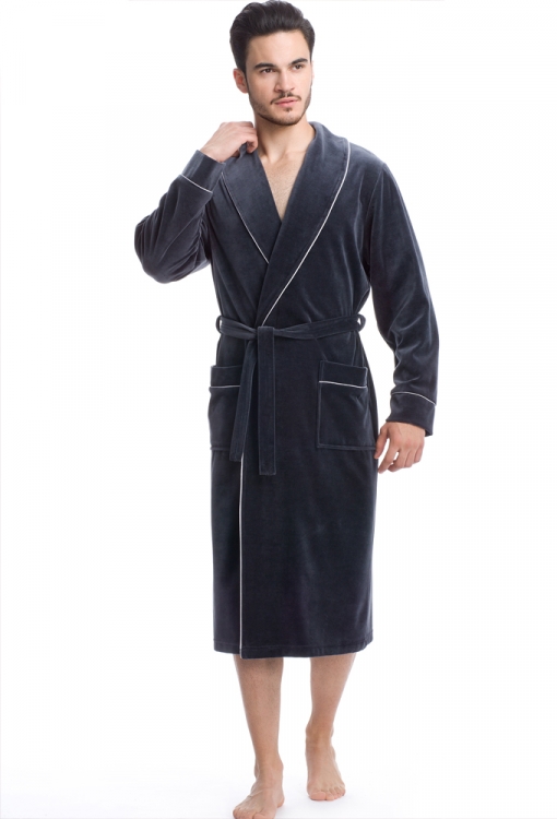 Классический мужской халат от польского бренда Dorota. Халат выполнен из высококачественного натурального велюра черного цвета, с длинными рукавами и шалевым воротником, завязывается на запах с помощью пояса. Длина модели чуть ниже колен, по бокам два глубоких накладных кармана, борта, карманы и рукава украшены кантом белого цвета. Халат теплый и комфортный, будет замечательным подарком для любимого человека.