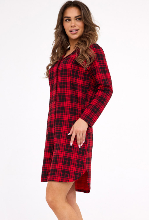 Стильная ночная рубашка Tracy от польского бренда Cornette. Рубашка выполнена из качественного и мягкого хлопка, красного цвета в черный клетчатый принт, прямого силуэта и длиной выше колен. Модель с длинными рукавами, отложным воротником и удобными боковыми карманами, застегивается на пуговицы. Спинка изделия слегка удлиненная, боковые линии внизу обработаны закругленными разрезами. Рубашка очень красивая и комфортная, упакованная в картонную коробку подойдет в качестве подарка любимому или близкому человеку.