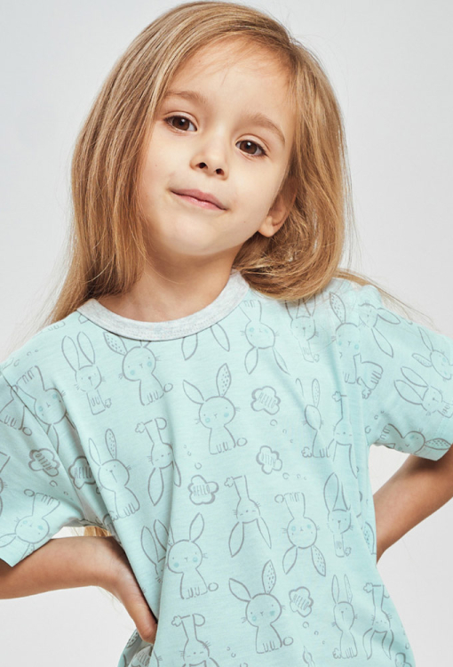 Летняя детская ночнушка Arleta от польского бренда Taro. Ночнушка выполнена из мягкого и качественного хлопка, бирюзового цвета с принтом в виде забавных зайчиков, свободного кроя и длиной выше колен. Модель с круглым вырезом горла и короткими рукавами, по линии выреза обработана однотонным кантом бирюзового цвета. Ночнушка очень красивая и комфортная, идеально подходит для теплых ночей и вечеров, также будет замечательным подарком для любимого ребенка.