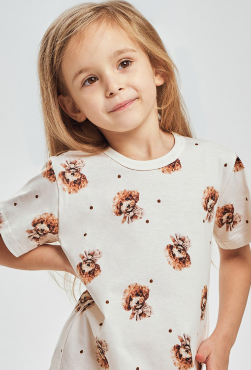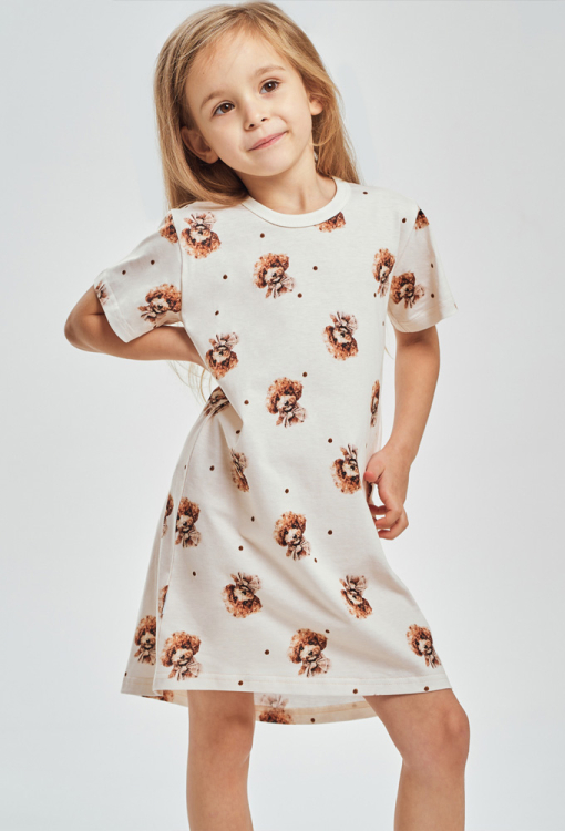 Очаровательная детская ночнушка Coco от польского бренда Taro. Ночнушка выполнена из мягкого и качественного хлопка, кремового цвета с принтом в виде милых собачек коричневого цвета, свободного кроя и длиной выше колен. Модель с круглым вырезом горла и короткими рукавами, по линии выреза обработана однотонным кантом. Ночнушка очень красивая и комфортная, также будет замечательным подарком для любимого ребенка.