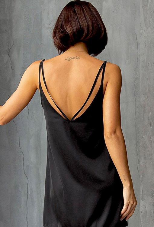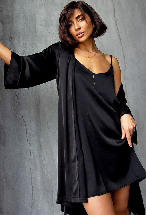 Восхитительный комплект женская ночнушка с халатом Shine от украинского бренда TimiRilla. Комплект выполнен из качественного и мягкого искусственного шелка черного цвета и состоит из ночнушки свободного силуэта и халата с рукавами 3/4. Ночнушка на тонких регулированных бретелях, с V-образным декольте и длиной выше колен, на спинке украшена дополнительными лямками. Халат свободного кроя и длиной выше колен, завязывается на запах с помощью пояса, рукава слегка расширенные и обработаны свободными манжетами. Комплект роскошный и очень комфортный, также будет отличным подарком для любимого или близкого человека.
