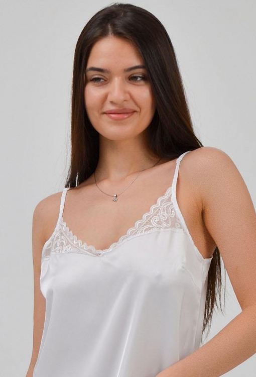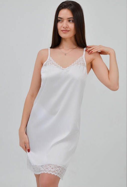 Изящная женская ночнушка из коллекции Ornelia от украинского бренда Leinle. Ночнушка выполнена из мягкого и качественного искусственного шелка, белого цвета, свободного силуэта и с V-образным декольте. Модель длиной выше колен, на тонких регулируемых бретелях и с глубоким вырезом на спине, линии декольте, спинка и низ украшены вставками из ажурного кружева. Ночнушка очень красивая и комфортная, подчеркнет женственность домашнего образа, а также может быть отличным подарком для любимого и близкого человека.