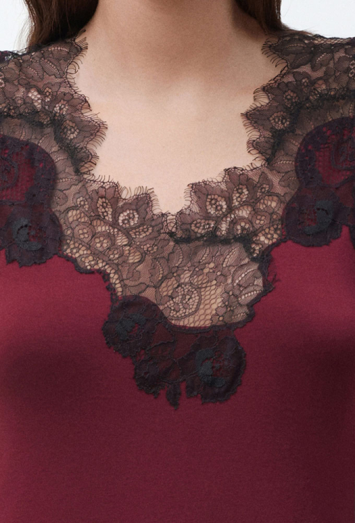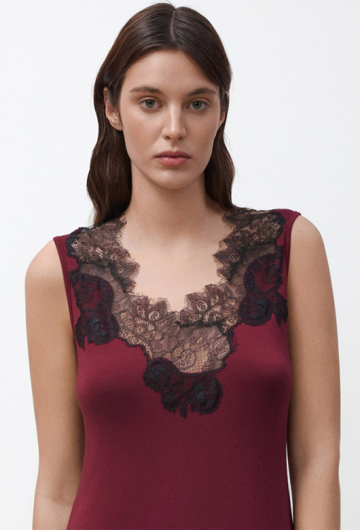 Красивая женская ночнушка из коллекции Angel’s Touch от итальянского бренда Effetto. Ночнушка выполнена из мягкого и качественного бамбука бордового цвета, полуприлегающего силуэта и длиной выше колен. Модель на широких бретелях и с глубоким полукруглым вырезом, по линии декольте и внизу украшена роскошным кружевом с вырезным краем и ресничками черного цвета. Ночнушка шикарная и очень комфортная, идеальна для создания романтичного вечернего образа, а также может быть замечательным подарком любимому и близкому человеку.