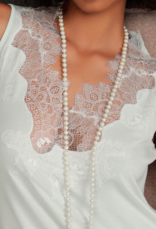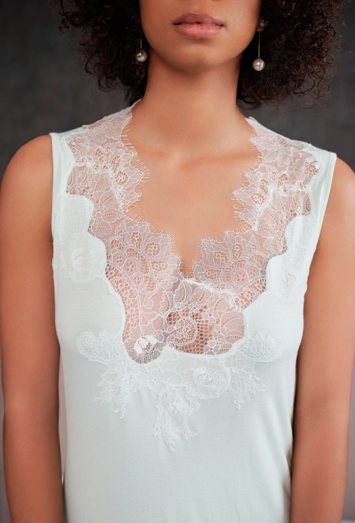 Красивая женская ночнушка из коллекции Angel’s Touch от итальянского бренда Effetto. Ночнушка выполнена из мягкого и качественного бамбука мятного цвета, прямого силуэта и длиной выше колен. Модель на широких бретелях и с глубоким полукруглым вырезом, по линии декольте и внизу украшена роскошным кружевом с вырезным краем и ресничками, на уровне бедра слева - полупрозрачная вставка с кружевными аппликациями. Ночнушка шикарная и очень комфортная, идеальна для создания романтичного вечернего образа, а также может быть замечательным подарком любимому и близкому человеку.