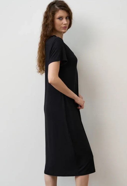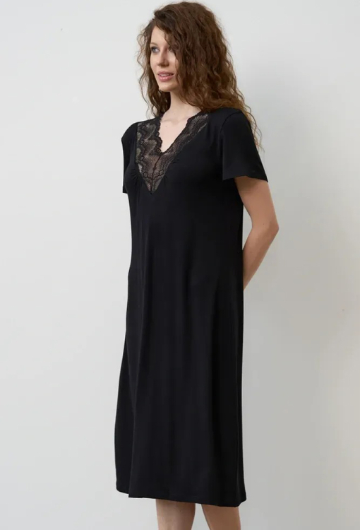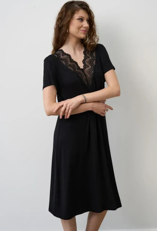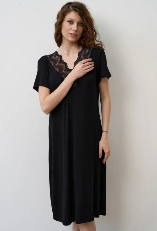 Классическая женская ночнушка от итальянского бренда Effetto. Ночнушка выполнена из мягкого и качественного бамбука черного цвета, свободного силуэта и длиной немного ниже колен. Модель с короткими рукавами и V-образным вырезом горла, украшена широкими вставками из ажурного кружева и мягкими складками по линии декольте. Ночнушка очень красивая и комфортная, превратит обычный вечер в момент покоя, тепла и гармонии, а также может быть замечательным подарком любимому и близкому человеку.