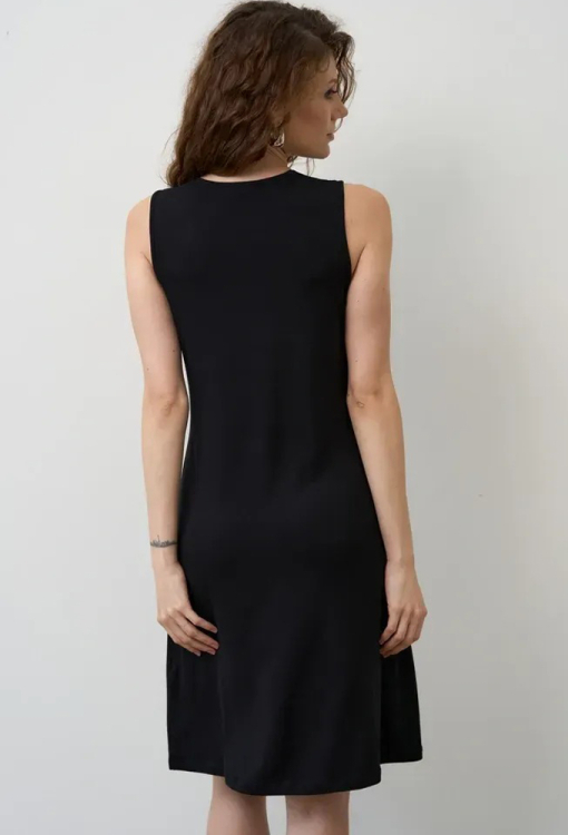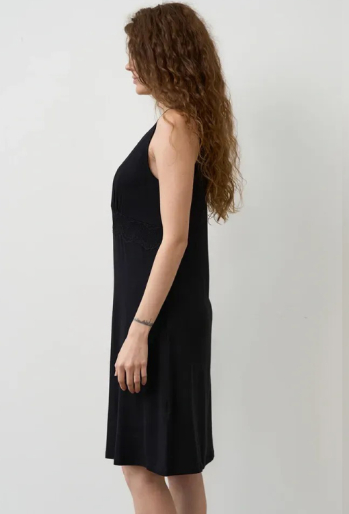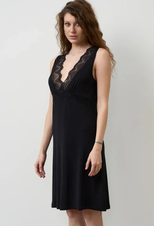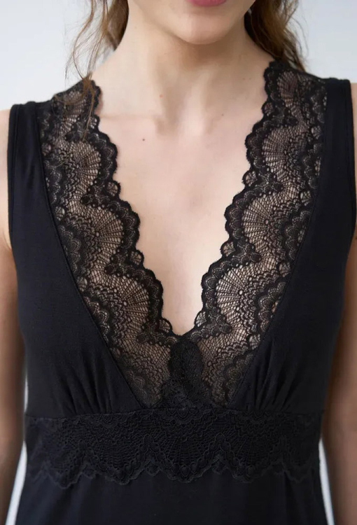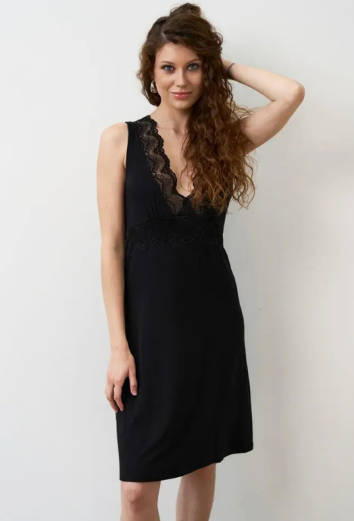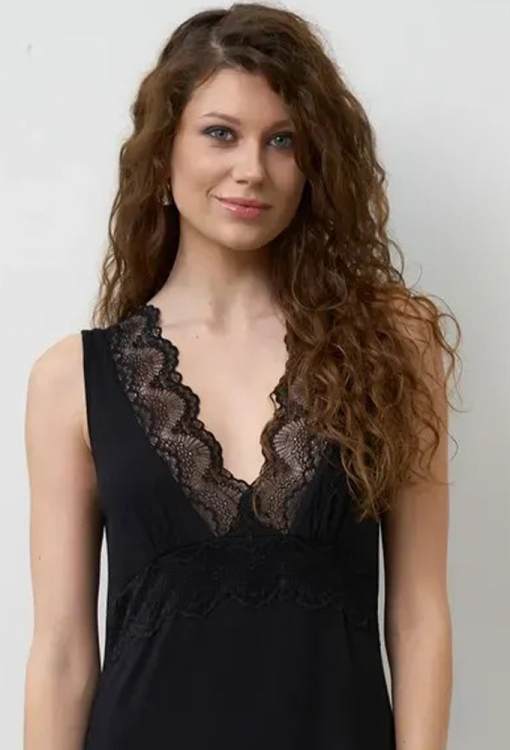 Элегантная женская ночнушка от итальянского бренда Effetto. Ночнушка выполнена из мягкого и качественного бамбука черного цвета, полуприлегающего силуэта и длиной немного выше колен. Модель без рукавов с отрезным лифом и глубоким V-образным вырезом горла, украшена вставками из ажурного кружева по линии декольте и под грудью. Ночнушка очень красивая и комфортная, превратит обычный вечер в момент покоя, тепла и гармонии, а также может быть замечательным подарком любимому и близкому человеку.