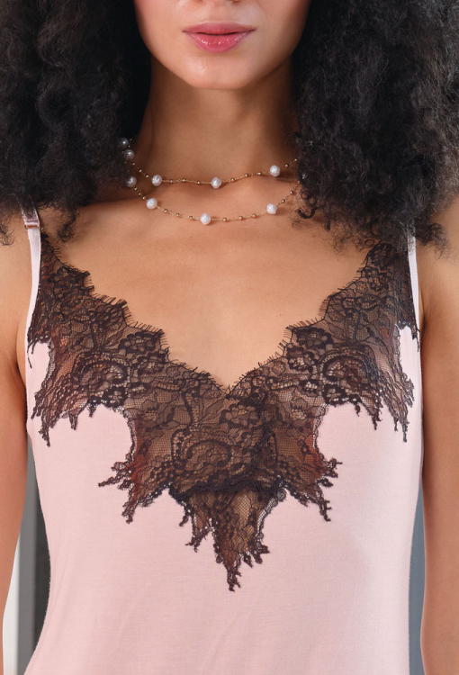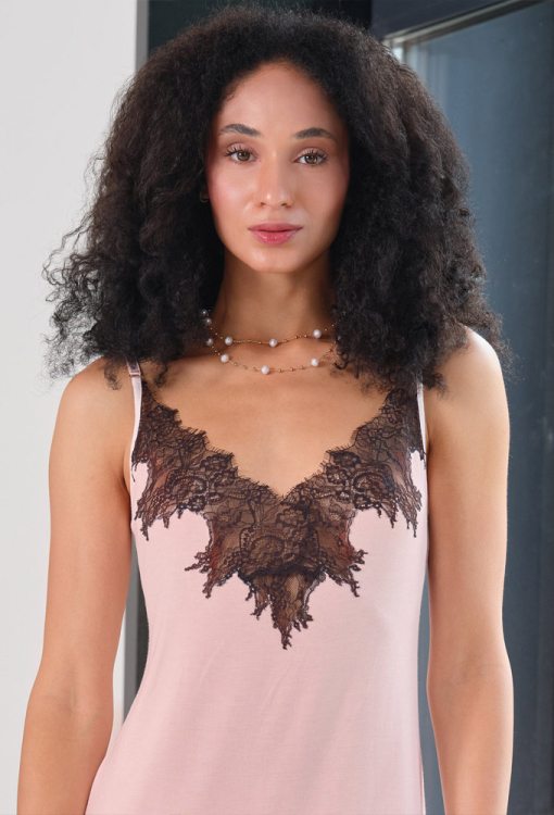 Нежная женская ночнушка из коллекции Elegent Enigma от итальянского бренда Effetto. Ночнушка выполнена из мягкого и качественного бамбука розового цвета, полуприлегающего силуэта и длиной выше колен. Модель на тонких регулируемых бретелях, с V-образным вырезом и высоким разрезом слева, по линии декольте и внизу украшена фигурно вырезным кружевом с цветочным узором черного цвета. Ночнушка очень красивая и комфортная, идеальна для создания романтичного вечернего образа, а также может быть замечательным подарком любимому и близкому человеку.