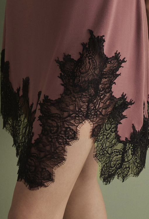 Непревзойденная женская ночнушка из коллекции Elegent Enigma от итальянского бренда Effetto. Ночнушка выполнена из мягкого и качественного бамбука цвета пудровая роза, полуприлегающего силуэта и длиной выше колен. Модель на тонких регулируемых бретелях и с V-образным декольте, внизу обработана высоким разрезом и вырезным кружевом черного цвета. Лиф модели также покрыт черным кружевом, включая бретели и линию под грудью, спинка украшена кружевными вставками и обработана застежкой. Ночнушка очень красивая и комфортная, идеальна для создания роскошного домашнего образа, а также может быть замечательным подарком любимому и близкому человеку.