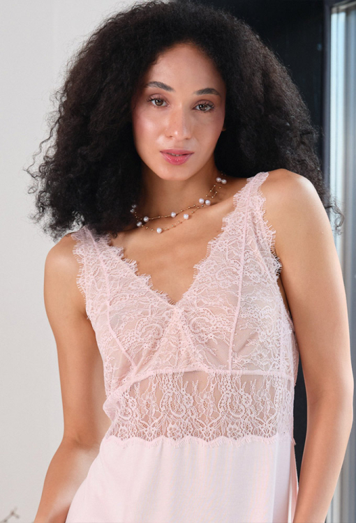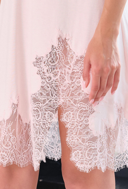 Непревзойденная женская ночнушка из коллекции Elegent Enigma от итальянского бренда Effetto. Ночнушка выполнена из мягкого и качественного бамбука розового цвета, полуприлегающего силуэта и длиной выше колен. Модель на тонких регулируемых бретелях и с V-образным декольте, внизу обработана высоким разрезом и вставками из вырезного кружева. Лиф модели также покрыт кружевом, включая бретели и линию под грудью, спинка украшена кружевными вставками и обработана застежкой. Ночнушка очень красивая и комфортная, идеальна для создания роскошного домашнего образа, а также может быть замечательным подарком любимому и близкому человеку.