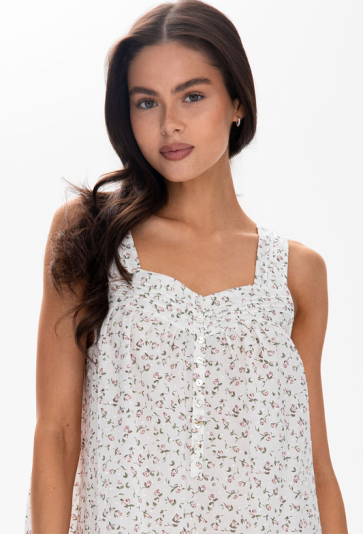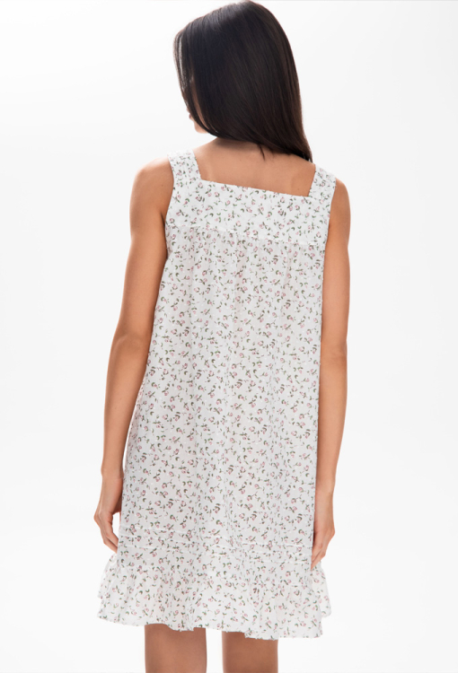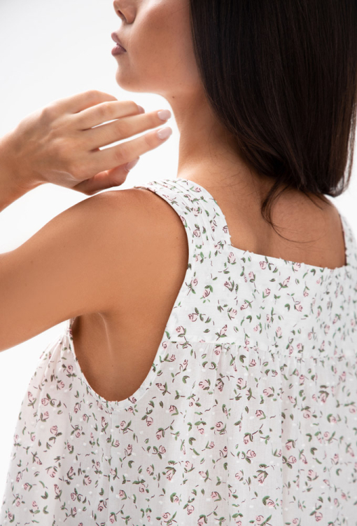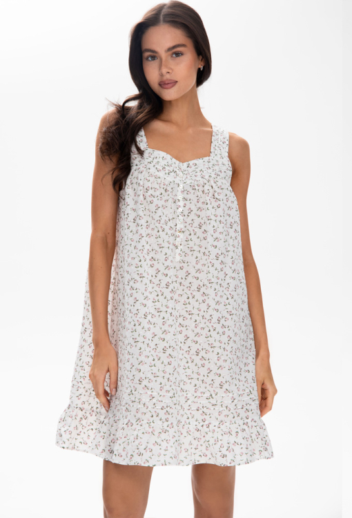 Очаровательная женская ночнушка Hloris от украинского бренда German Volf. Ночнушка выполнена из качественного и мягкого батиста, белого цвета в нежный принт из розовых цветов, свободного силуэта и длиной выше колен. Модель на широких бретелях, с квадратным декольте и таким же вырезом на спине, на груди застегивается на пуговицы, внизу обработана небольшим воланом. Вырез и спинка модели обработаны кокетками с мягкими сборками и вместе с бретелями украшены застроченными складками. Ночнушка очень красивая и комфортная, также может быть отличным вариантом подарка близкому или любимому человеку!