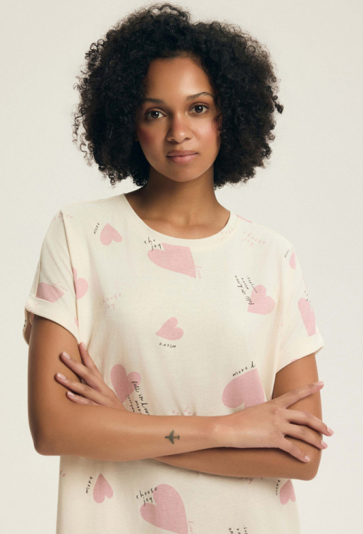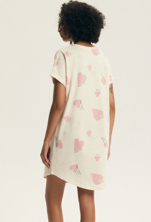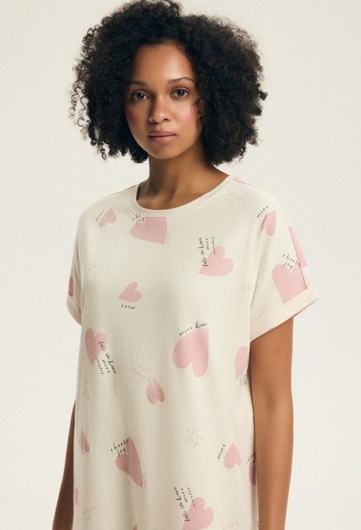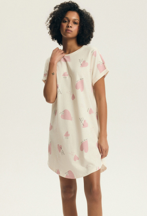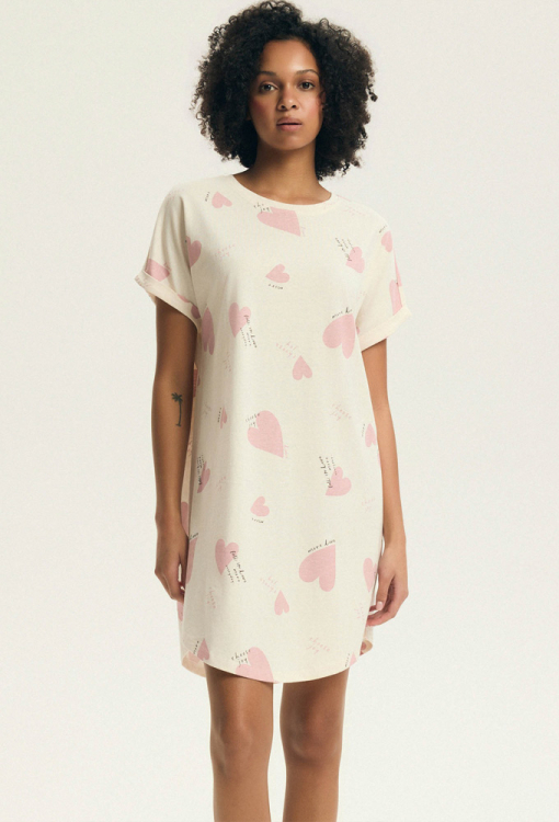 Удобная женская ночнушка Elain от польского бренда Henderson Ladies. Ночнушка выполнена из качественного и мягкого хлопка кремового цвета с принтом в виде крупных сердечек светло-розового цвета и надписей, свободного силуэта и длиной выше колен. Модель с короткими рукавами и круглым вырезом горла, по бокам внизу обработана закругленными разрезами, рукава оформлены отложными манжетами. Ночнушка стильная и очень комфортная, идеальна для сна и домашнего отдыха, а также может быть отличным подарком любимому или близкому человеку.