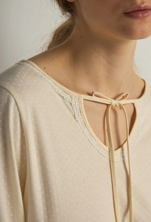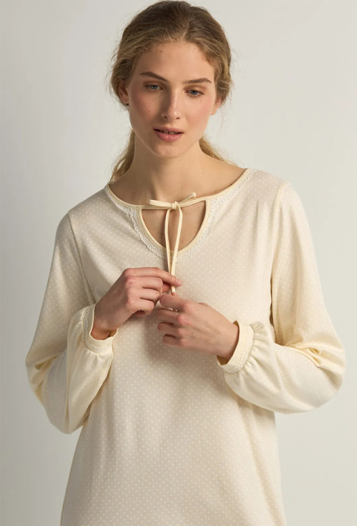 Классическая женская ночнушка из коллекции French Vanila от украинского бренда Ellen. Ночнушка выполнена из качественного и мягкого хлопка, кремового цвета в принт из мелких звездочек белого цвета, прямого силуэта и длиной ниже колен. Модель с длинными рукавами на манжетах и фигурным вырезом горла на завязке, по бокам внизу ночнушка обработана разрезами. Линия выреза и рукава изделия украшены тонким кружевом белого цвета. Ночнушка очень красивая и комфортная, также может быть прекрасной одеждой для дома или полезным подарком любимому и близкому человеку.