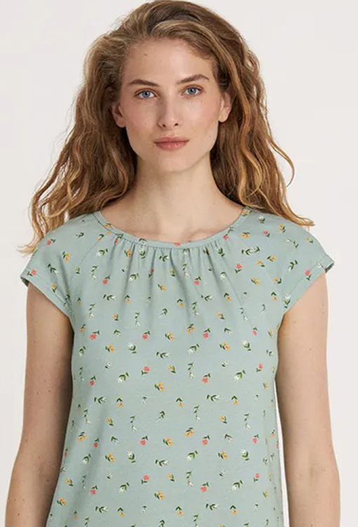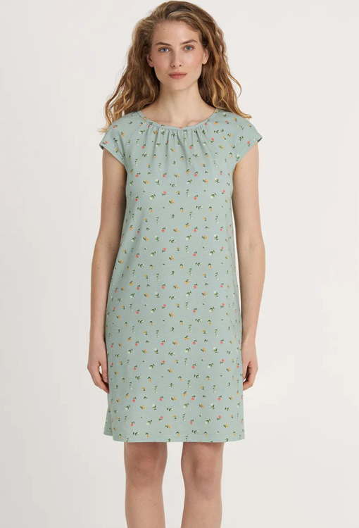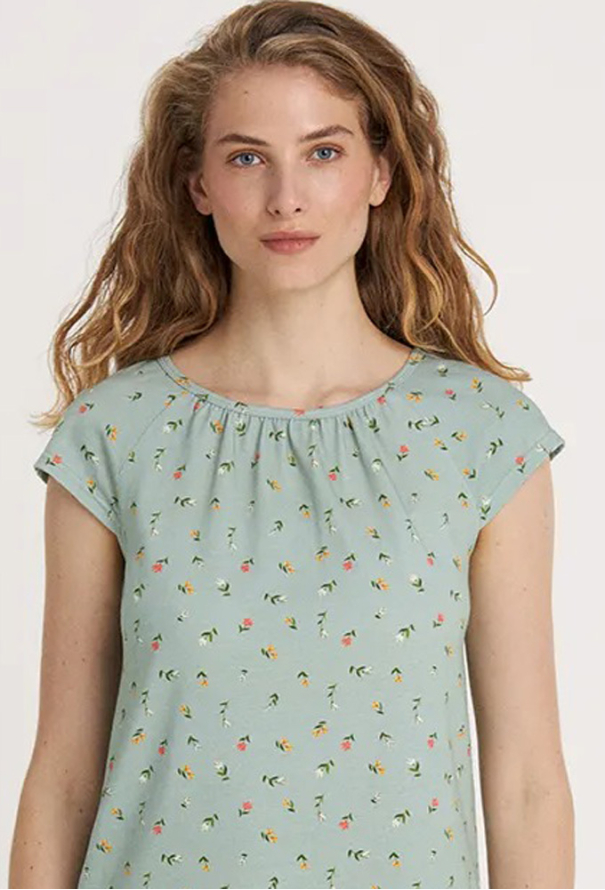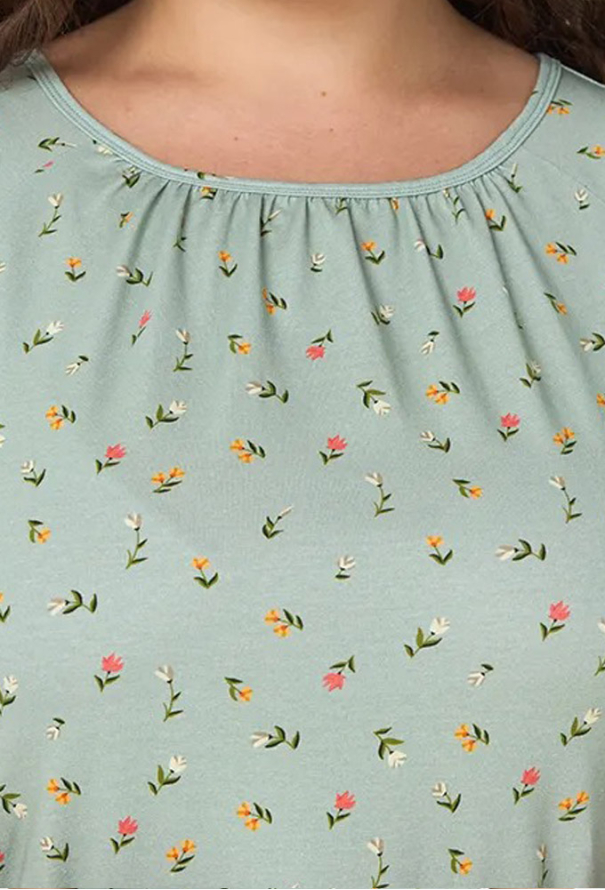Классическая женская ночнушка из коллекции Green Meadow от украинского бренда Ellen. Ночнушка выполнена из качественного и мягкого хлопка, зеленого цвета в мелкий цветочный принт розового и оранжевого цвета, с короткими рукавами и длиной выше колен. Модель прямого силуэта и с круглым вырезом горла, горловина обработана кантом и мягкими складками. Ночнушка очень красивая и комфортная, идеальна для сна в любое время года, также может быть замечательным подарком любимому и близкому человеку.