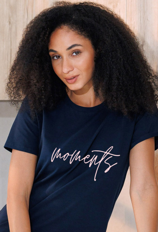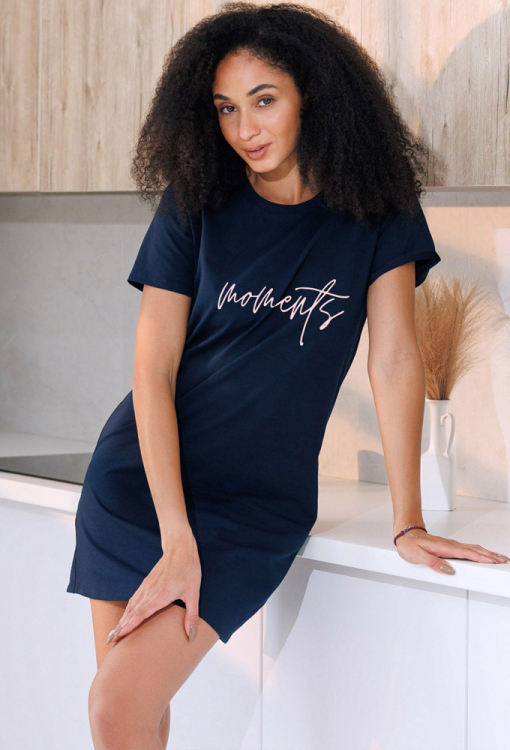 Стильная женская ночнушка из коллекции Hello Weekend от украинского бренда Roksana. Ночнушка выполнена из мягкого и качественного хлопка темно-синего цвета, прямого силуэта и длиной выше колен. Модель с короткими рукавами и круглым вырезом горла, спереди по центру украшена принтом в виде надписи "Moments". Ночнушка очень красивая и комфортная, идеальный вариант для сна и создания уютного домашнего образа, также может быть замечательным подарком любимому или близкому человеку.