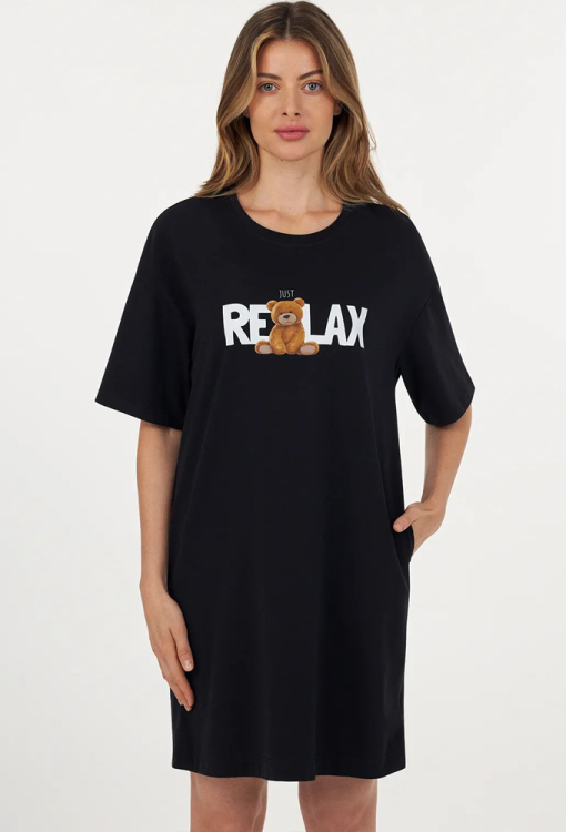 Стильная женская ночнушка из коллекции Just Relax от украинского бренда Ellen. Ночнушка выполнена из качественного и мягкого хлопка черного цвета, свободного силуэта и длиной выше колен. Модель с короткими рукавами и круглым вырезом горла, по центру украшена ярким принтом в виде плюшевого мишки и надписи "Just Relax". Изделие обладает превосходной воздухопроницаемостью и не сковывает движений во время сна. Ночнушка очень красивая и комфортная, также может быть прекрасной одеждой для дома или полезным подарком любимому и близкому человеку.