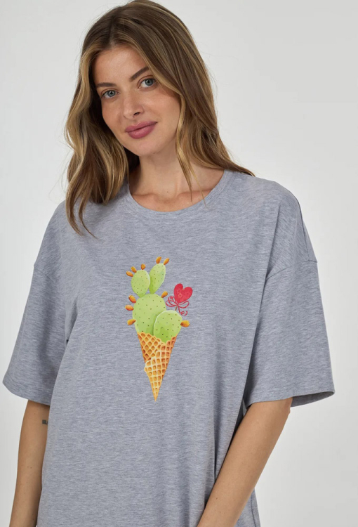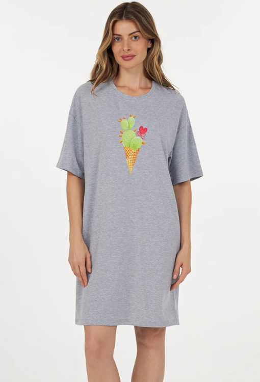 Стильная женская ночнушка из коллекции Kerry от украинского бренда Ellen. Ночнушка выполнена из качественного и мягкого хлопка серого цвета, свободного силуэта и длиной выше колен. Модель с короткими рукавами и круглым вырезом горла, спереди украшена принтом из шариков мороженного в виде салатового кактуса и сердечка красного цвета. Изделие обладает превосходной воздухопроницаемостью и не сковывает движений во время сна. Ночнушка очень красивая и комфортная, также может быть прекрасной одеждой для дома или полезным подарком любимому и близкому человеку.