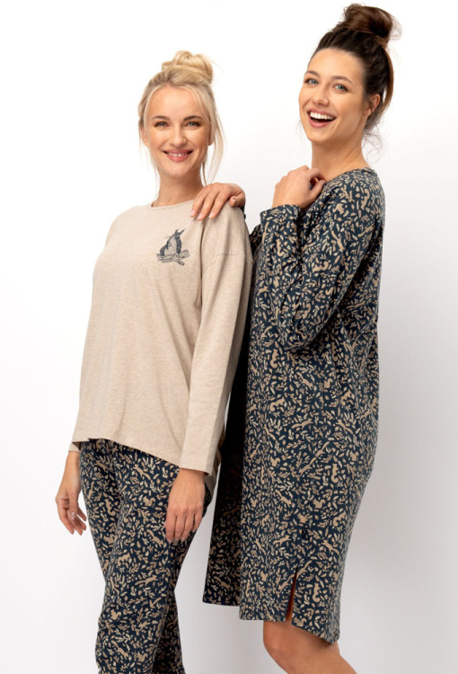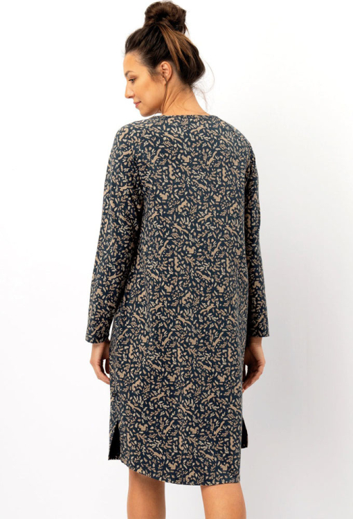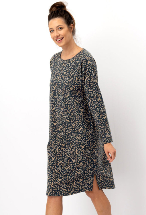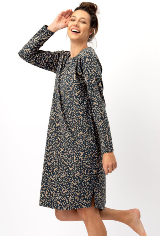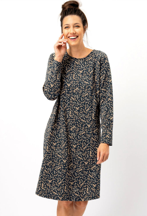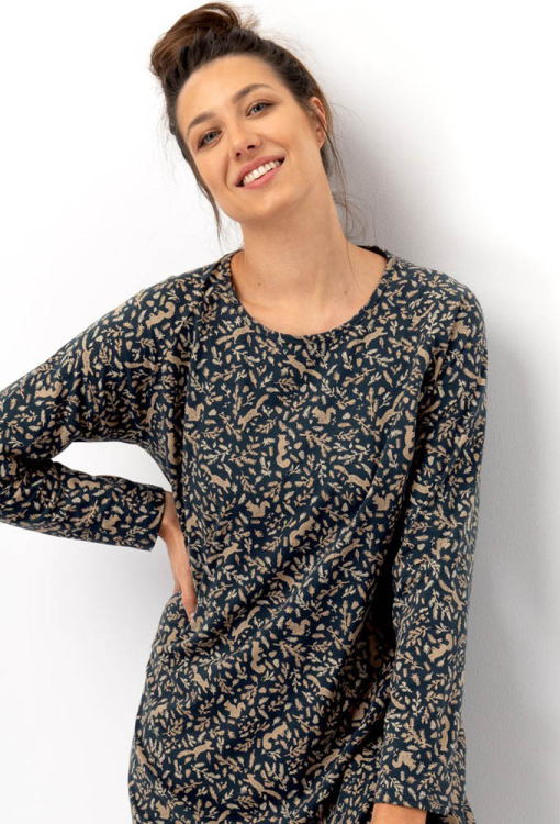 Классическая женская ночнушка от польского бренда Key. Ночнушка выполнена из качественного и мягкого хлопка, графитового цвета с осенним бежевым принтом в виде белок, ищущих орехи в листьях, с длинными рукавами и круглым вырезом горла. Модель свободного силуэта и длиной чуть ниже колен, по бока внизу обработана разрезами. Ночнушка красивая и очень удобная, обеспечит тепло во время сна и комфорт во время утренней спешки, также может быть полезным подарком близкому человеку.