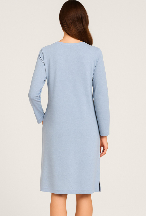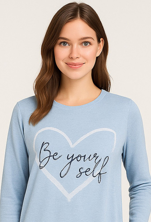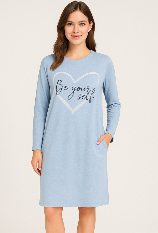 Классическая женская ночнушка из коллекции Melange от украинского бренда Roksana. Ночнушка выполнена из мягкого и качественного хлопка голубого цвета, прямого силуэта, с длинными рукавами и длиной чуть выше колен. Модель с круглым вырезом горла и удобными боковыми карманами, внизу по бокам обработана небольшими разрезами. На уровне груди изделие украшено принтом в виде большого контурного сердца и надписи "be your self". Ночнушка очень красивая и комфортная, идеальна для сна, утренних ритуалов, спокойных вечеров с книгой, а также для подарка любимому и близкому человеку.