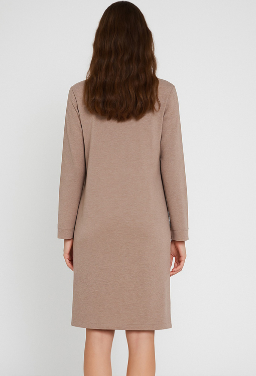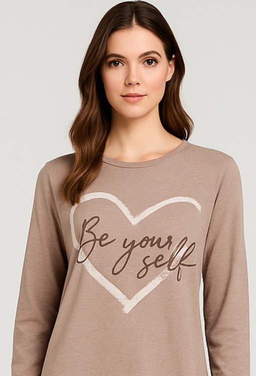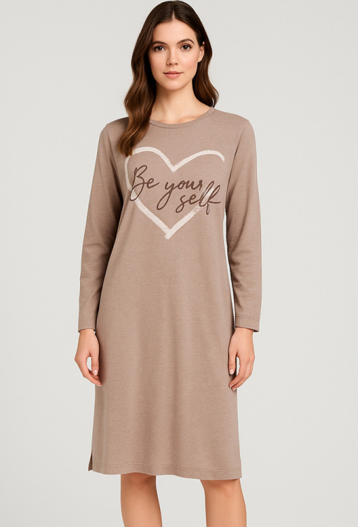Классическая женская ночнушка из коллекции Melange от украинского бренда Roksana. Ночнушка выполнена из мягкого и качественного хлопка коричневого цвета, прямого силуэта, с длинными рукавами и длиной чуть выше колен. Модель с круглым вырезом горла и удобными боковыми карманами, внизу по бокам обработана небольшими разрезами. На уровне груди изделие украшено принтом в виде большого контурного сердца и надписи "be your self". Ночнушка очень красивая и комфортная, идеальна для сна, утренних ритуалов, спокойных вечеров с книгой, а также для подарка любимому и близкому человеку.