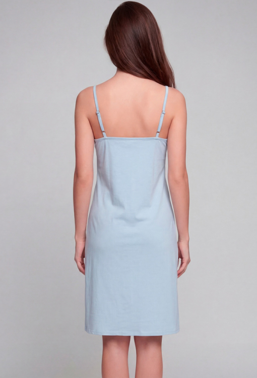 Утонченная женская ночнушка из коллекции Molly от украинского бренда Roksana. Ночнушка выполнена из мягкого и качественного хлопка голубого цвет, полуприлегающего силуэта и длиной немного выше колен. Модель с тонкими регулируемыми бретелями и V-образным вырезом горла, по линии выреза украшена вставками из ажурного кружева. Ночнушка очень красивая и комфортная, идеальна для сна, утренних ритуалов, спокойных вечеров с книгой, а также для подарка любимому и близкому человеку.