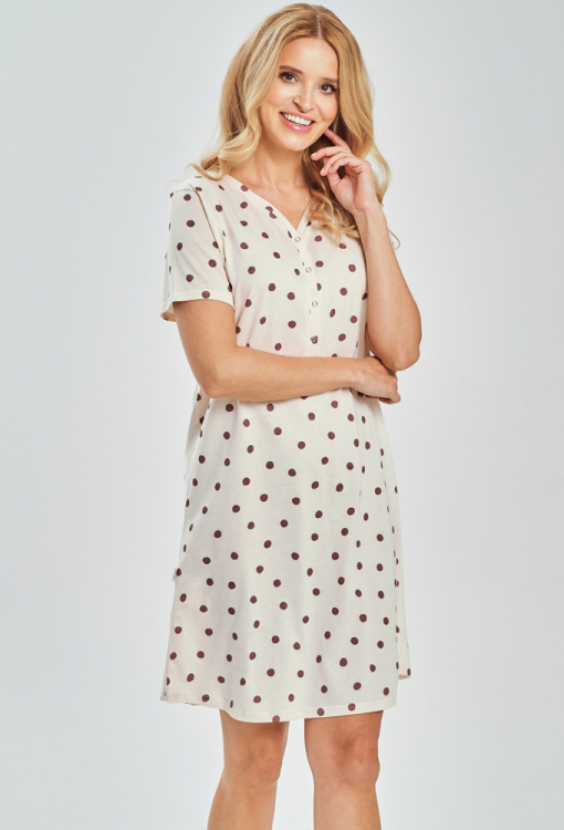 Очаровательная женская ночнушка Maia от польского бренда Taro. Ночнушка выполнена из качественного и мягкого хлопка, кремового цвета в коричневый горошек, прямого силуэта и длиной выше колен. Модель с короткими рукавами и V-образным вырезом горла, дополнена застежкой на кнопках. Ночнушка очень красивая и приятная к телу, идеальна как для сна, так и для ленивых утренних часов, а также может быть полезным подарком для близких людей.