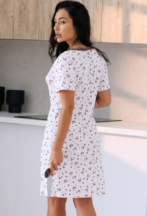 Комфортная женская ночнушка из коллекции Объятия от украинского бренда Roksana. Ночнушка выполнена из мягкого и качественного хлопка в рубчик, белого цвета в принт из букетиков коричневого цвета, прямого силуэта и длиной выше колен. Модель с короткими рукавами и с V-образным вырезом горла, украшенным тонким ажурным кружевом коричневого цвета. Ночнушка очень красивая и удобная, идеальна для сна, утренних ритуалов, спокойных вечеров с книгой, а также для подарка любимому и близкому человеку.