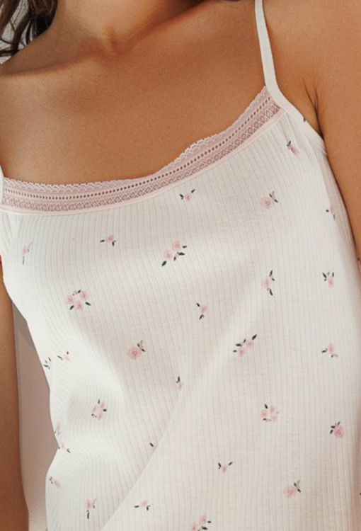 Нежная женская ночнушка из коллекции Розквитай от украинского бренда Roksana. Ночнушка выполнена из мягкого и качественного хлопка в рубчик, белого цвета с принтом в виде мелких розовых цветочков, с тонкими регулируемыми бретелями и прямоугольным декольте. Модель прямого силуэта и длиной выше колен выглядит аккуратно и одновременно комфортно. Вырез изделия украшен вставками из тонкого кружева розового цвета, низ обработан волнистой отделкой. Ночнушка очень красивая и комфортная, идеальна для сна и домашнего утра, также подойдет как подарок близкому человеку.