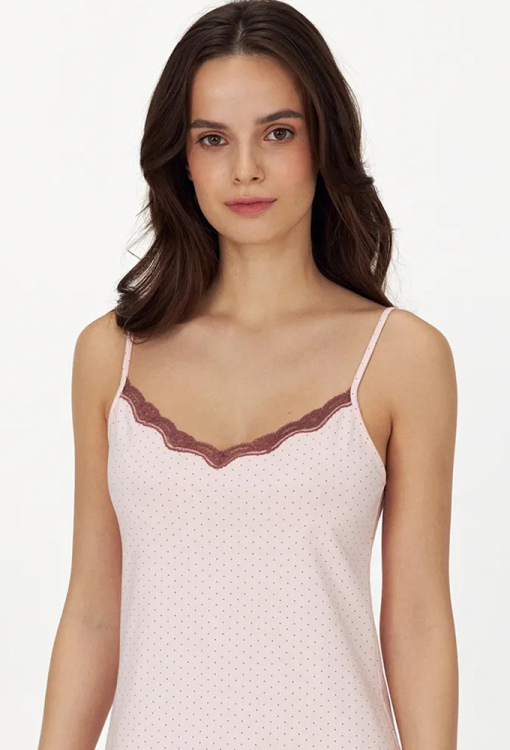 Изящная женская ночнушка из коллекции Sherry от украинского бренда Ellen. Ночнушка выполнена из качественного и мягкого хлопка, розового цвета в графитовый точечный принт, полуприлегающего силуэта и длиной выше колен. Модель с тонкими регулируемыми бретелями и V-образным декольте, внизу по бокам обработана разрезами. Линия декольте, низ и разрезы ночнушки украшены тонкими вставками из ажурного кружева коричневого цвета. Изделие обладает превосходной воздухопроницаемостью и не сковывает движений во время сна. Ночнушка очень красивая и комфортная, также может быть прекрасной одеждой для дома или полезным подарком любимому и близкому человеку.