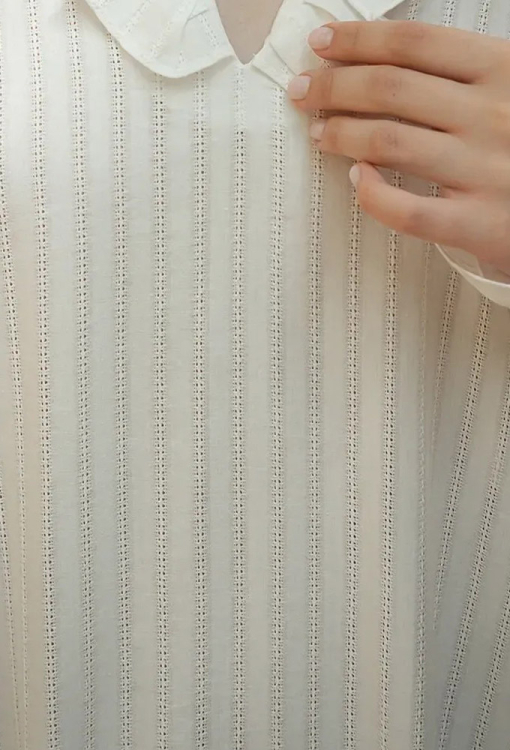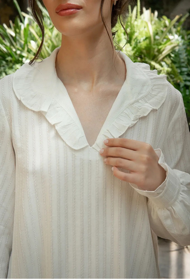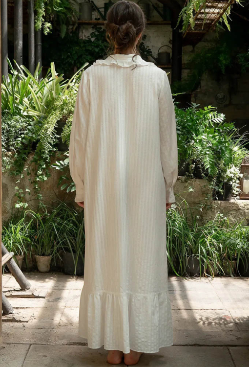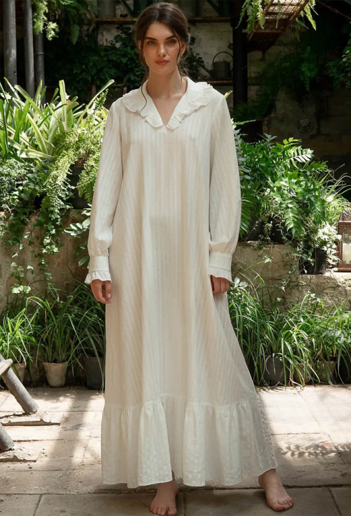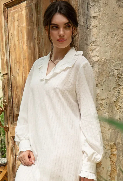Роскошная женская ночнушка Victoria от украинского бренда Forly. Ночнушка выполнена из качественного и мягкого хлопка с ажурными полосками в викторианском стиле кремового цвета, свободного кроя и длиной в пол. Модель с длинными рукавами на манжетах, V-образным вырезом горла и отложным воротником, манжеты застегиваются на пуговицы. Воротник и рукава изделия украшены рюшами, низ обработан широким воланом. Ночнушка очень красивая и приятная к телу, идеальна для сна, а также подарка любимому и близкому человеку.