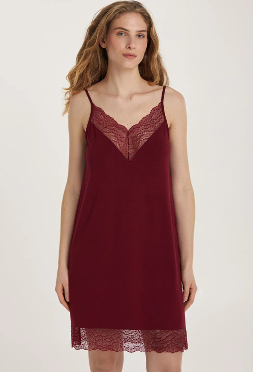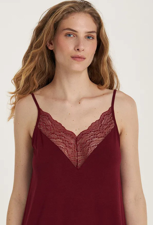 Красивая женская ночнушка из коллекции Meryl от украинского бренда Ellen. Ночнушка выполнена из качественного и мягкого модала бордового цвета, полуприлегающего силуэта и длиной выше колен. Модель с тонкими регулируемыми бретелями, V-образным декольте и таким же вырезом на спине, спереди, на спинке по линии выреза и внизу украшена широкими вставками из ажурного кружева. Ночнушка очень удобная и приятная к телу, идеальна для сна и утренних ритуалов, также может быть замечательным подарком любимому или близкому человеку.
