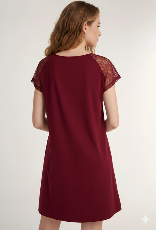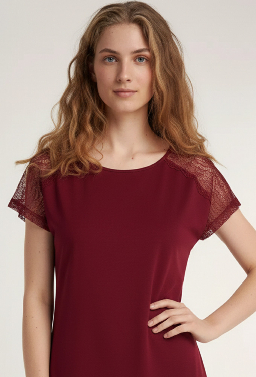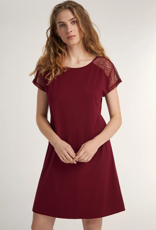 Классическая женская ночнушка из коллекции Meryl от украинского бренда Ellen. Ночнушка выполнена из качественного и мягкого модала бордового цвета, прямого силуэта и длиной выше колен. Модель с короткими кружевными рукавами со спущенным плечом и круглым вырезом горла, обеспечивает легкость и свободу движений. Ночнушка очень удобная и комфортная, идеально подходит для спокойного сна и уютных утренних ритуалов, а также станет замечательным подарком для любимого или близкого человека.