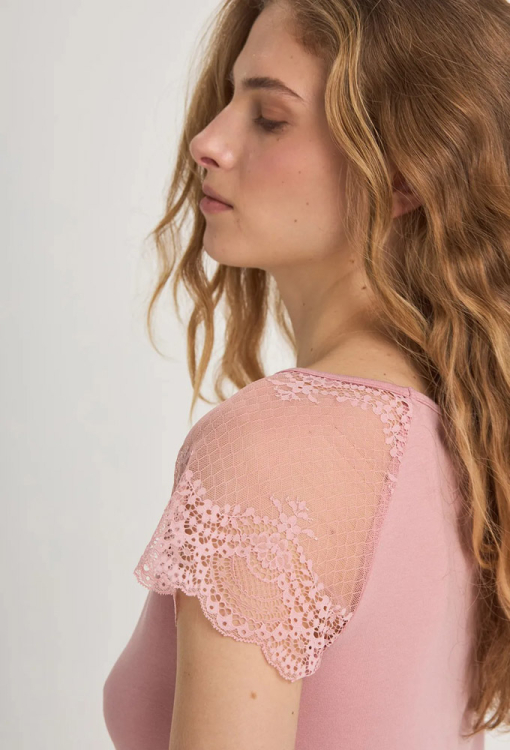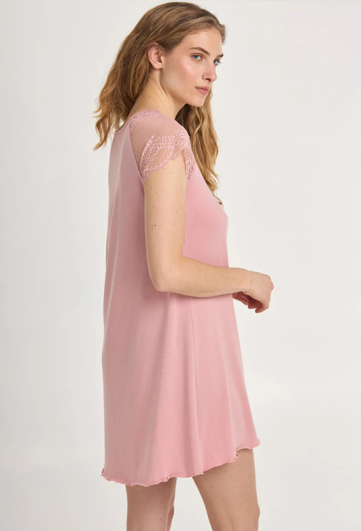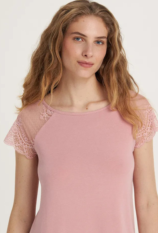 Классическая женская ночнушка из коллекции Molly от украинского бренда Ellen. Ночнушка выполнена из качественного и мягкого смесового модала розового цвета, прямого силуэта и длиной выше колен. Модель с короткими кружевными рукавами и круглым вырезом горла, внизу украшена декоративным волнистым швом. Ночнушка очень красивая и приятная к телу, идеальна для сна и домашнего отдыха, также может быть замечательным подарком любимому или близкому человеку.
