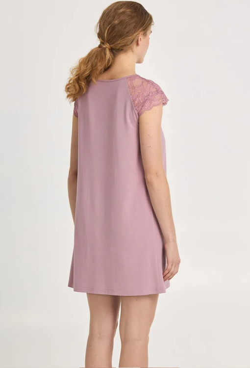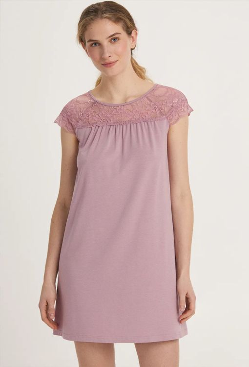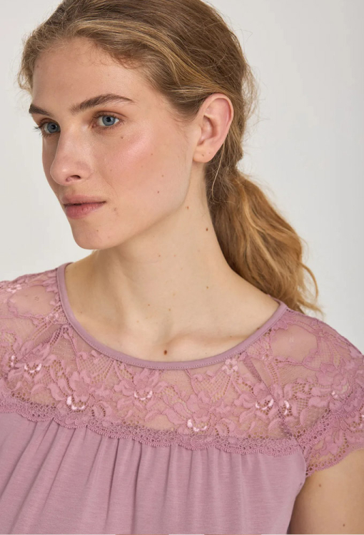 Классическая женская ночнушка из коллекции Rosalie от украинского бренда Ellen. Ночнушка выполнена из качественного и мягкого смесового модала розового цвета, прямого силуэта и длиной выше колен. Модель с короткими рукавами и круглым вырезом горла, вверху спереди украшена широкой вставкой из ажурного кружева, рукава также выполнены из кружева. Ночнушка очень красивая и приятная к телу, идеальна для сна и домашнего отдыха, также может быть замечательным подарком любимому или близкому человеку.