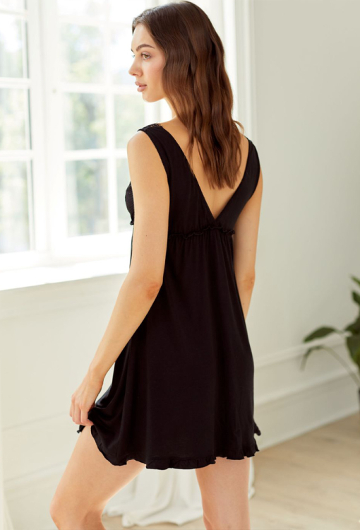 Очаровательная женская ночнушка из коллекции Viki от украинского бренда Your Touch. Ночнушка выполнена из мягкого и качественного модала черного цвета, на широких бретелях и с V-образным декольте. Модель полуприлегающего силуэта и длиной выше колен, под грудью и внизу украшена рюшами. Декольте изделия украшено широкими вставками из ажурного кружева, спинка обработана глубоким V-образным вырезом. Ночнушка очень красивая и комфортная, придаст привлекательности домашнему образу, также может быть замечательным подарком любимому или близкому человеку.