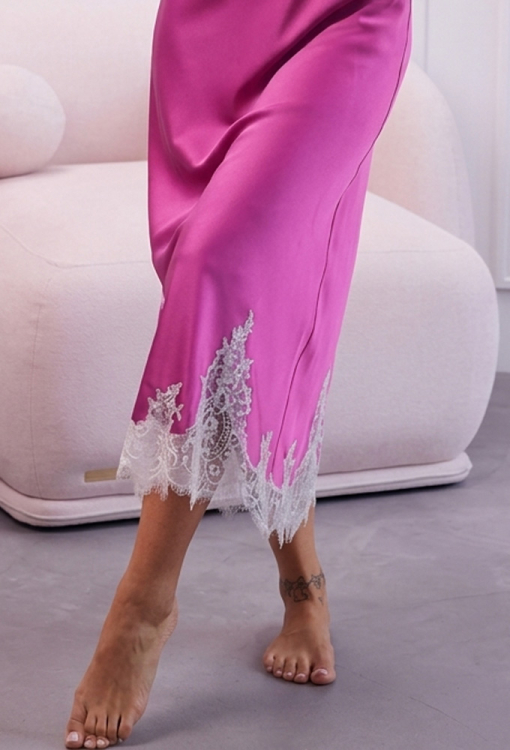 Шикарная женская ночнушка из коллекции Azalea от украинского бренда Komilfo. Ночнушка выполнена из мягкого и качественного шелк-сатина цвета фуксии, полуприлегающего силуэта и длиной ниже колен. Модель с тонкими регулируемыми бретелями, отрезным лифом и с глубоким V-образным декольте. Под грудью, внизу и на спине модель украшена роскошным вырезным кружевом белого цвета. Ночнушка очень красивая, яркая и невероятно комфортная, идеальна для сна и особенных моментов в домашнем окружении, упакованная в фирменную коробку, подойдет для подарка любимой женщине или девушке!