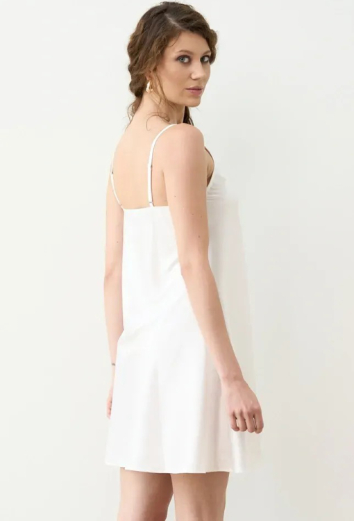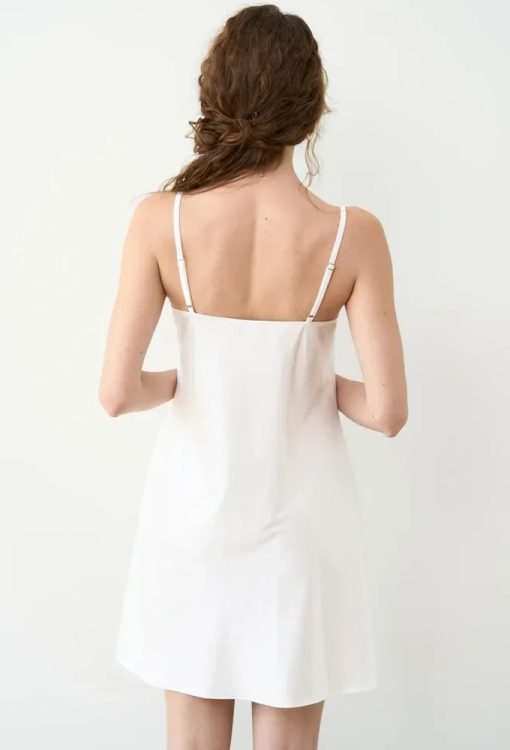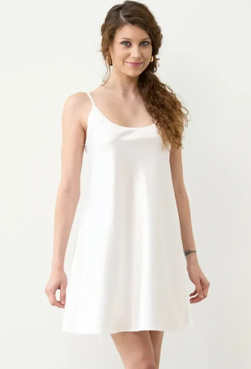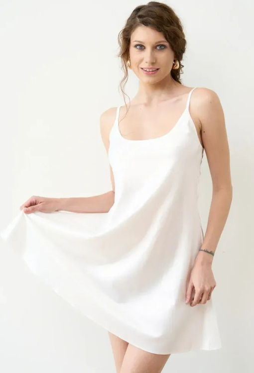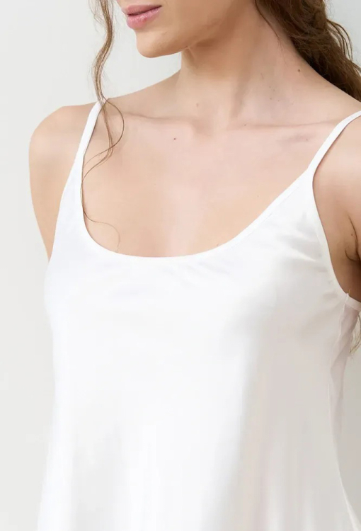 Нежная и воздушная женская ночнушка из коллекции Classic от итальянского бренда Effetto. Ночнушка выполнена из мягкого и качественного шелк-сатина белого цвета, свободного силуэта и длиной выше колен. Модель на тонких регулируемых бретелях и с круглым декольте - лаконичность и комфорт на каждый день. Ночнушка очень красивая и приятная к телу, идеальна для сна и романтического домашнего образа, а также может быть замечательным подарком любимому и близкому человеку.