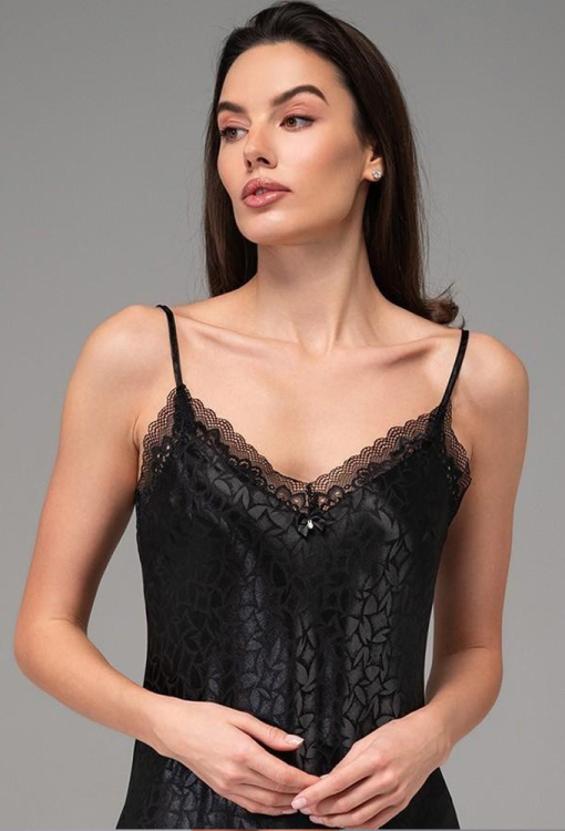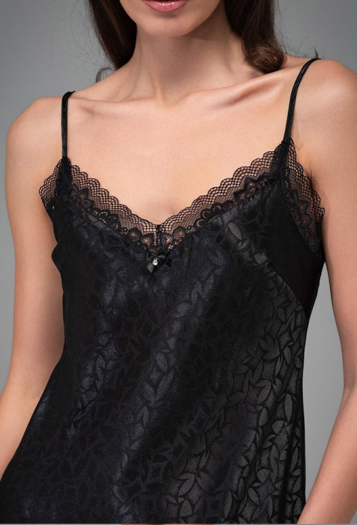 Изысканная женская ночнушка из коллекции Joanna Black от итальянского бренда Mia-Amore. Ночнушка выполнена из искусственного шелка на жаккардовой основе черного цвета, полуприлегающего силуэта и длиной выше колен. Модель на тонких регулируемых бретелях, с выточками на груди и V-образным декольте. По линии выреза и внизу изделие украшено вставками из изящного ажурного кружева и маленьким атласным бантиком с кристаллом Swarovski в центре декольте. Ночнушка очень красивая и комфортная, отличный вариант для подарка любимому или близкому человеку!